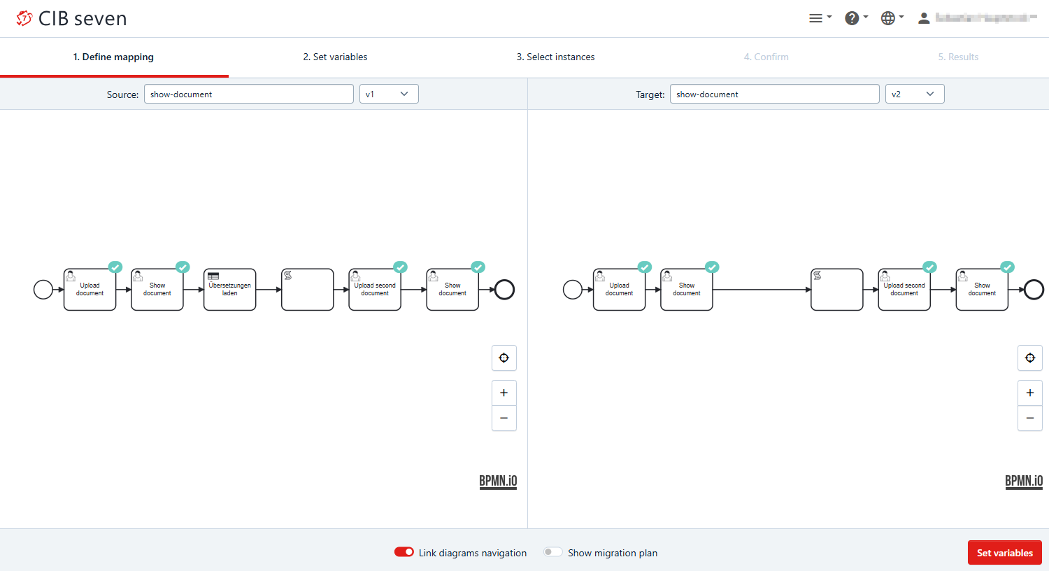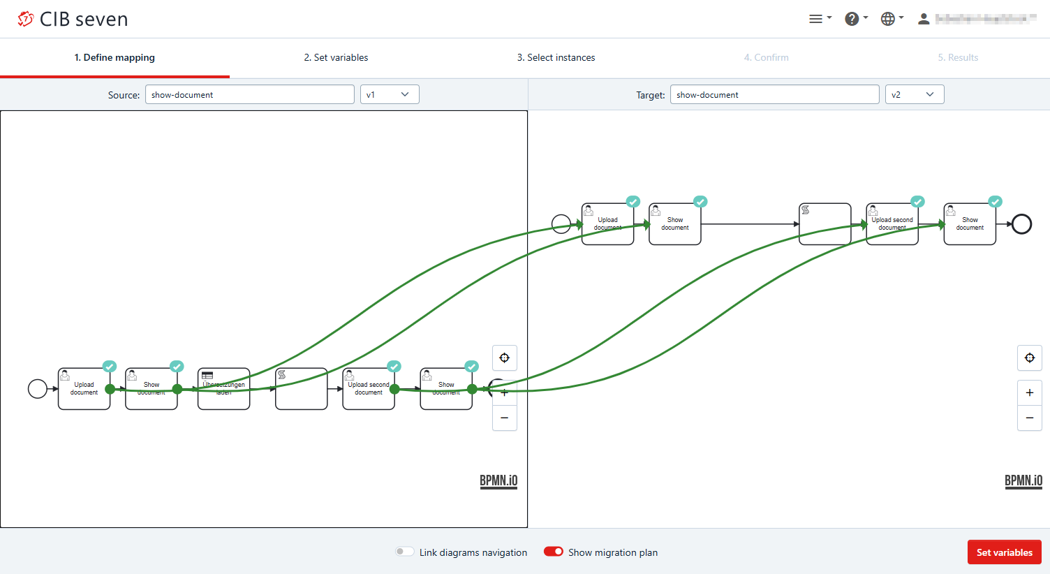 Open the Process Instance you want to migrate via Cockpit - Processes and find the process to migrate. From the Actions tab, you can directly choose the Migrate icon. Alternatively, open the process by clicking the name or the Process key. Find the definition version you want to migrate from in the History Versions tab on the left and select it. Now click on the Migrate icon on the right. You will be presented with the migration page. Here, the version and the definition key for the source and the target definition are already preset and you can change them to your requirements. After selecting the versions, the respective diagrams are shown below. The left side shows the selected currently running source. The right side shows the target definition we are migrating to. When you select the Show Migration Plan toggle, a default migration plan is automatically generated. Successfully mapped activities show a green checkmark. Green lines visualize the mapping.