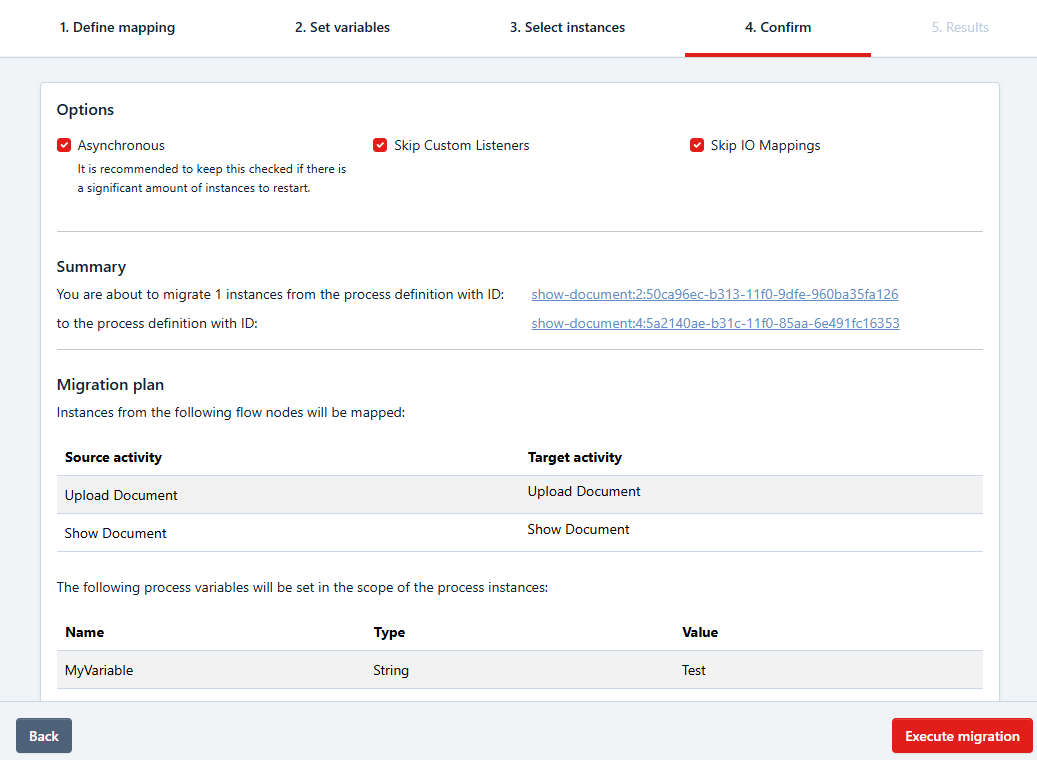 The Summary section shows how many and which instances will be migrated. It displays the source process definition ID and the target process ID. In the Migration Plan section you will see a table with two columns, containing the source activities and the mapped target activities.
