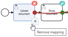 An incorrect mapping will be indicated by a red line and an X on both activities. This could be the case if you try to map activity types that do not match, e.g. a user task to a start event.