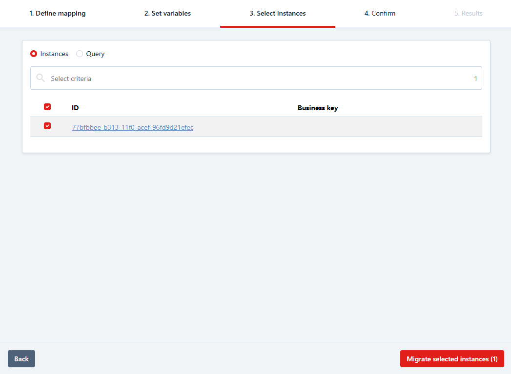 The next step allows you to choose the instances you want to migrate. All possible instances of the source process definition are listed here. you can filter them via the search bar. Here you can choose between different search criteria to narrow down the instance you want to migrate. Once all relevant instances are selected, you can move to the next step and migrate the selected instances.