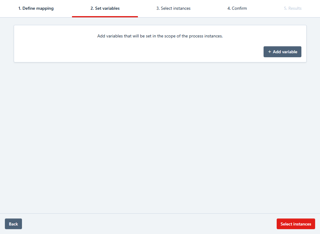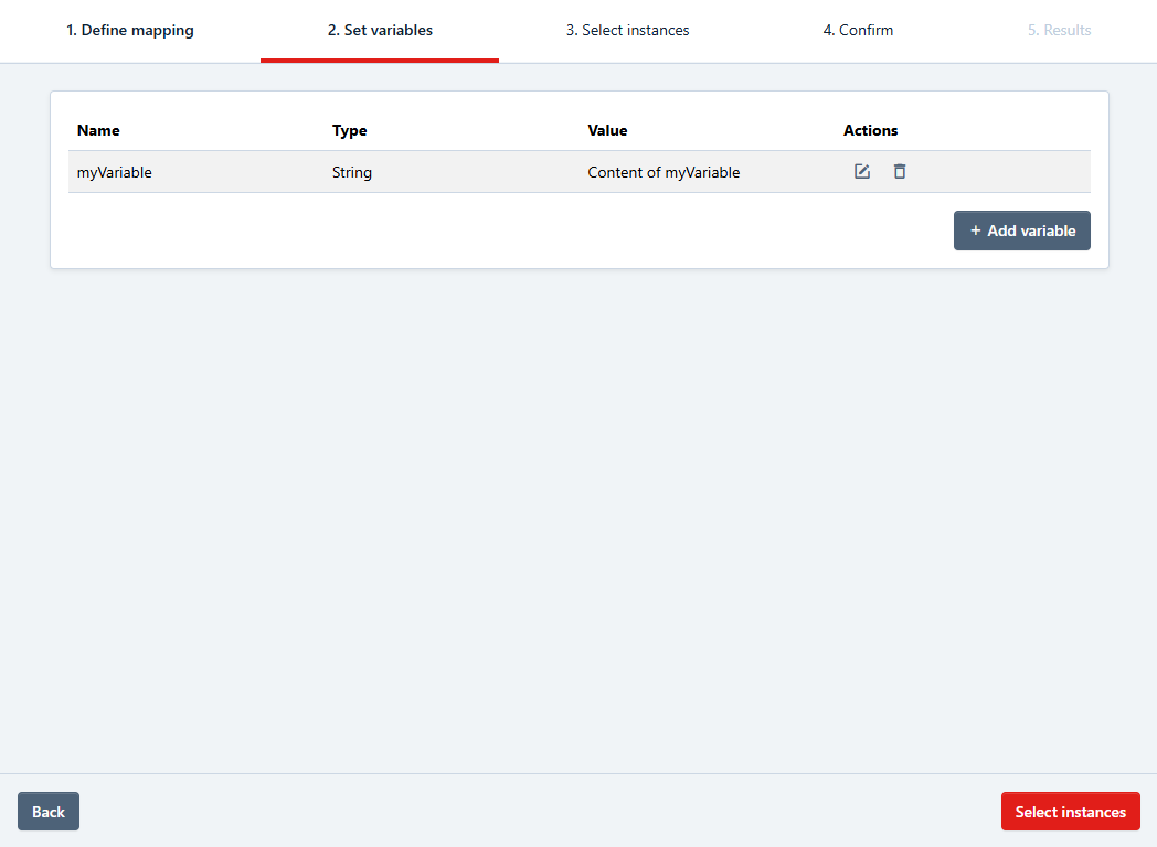 When the mapping is done, you can click on Set Variables for the next step. Here you can add variables into the process instance scope if needed. To do so click the Add Variable button and enter the variable name, variable type and variable value.